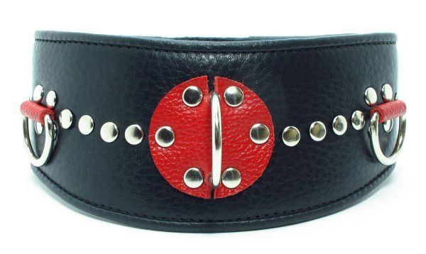 Стильный кожа­ный ошей­ник "BDSM-​Арсенал" в брутальном черном цвете с дизайном из красной кожи и металлических клепок - незаменимый атрибут всех жарких игр!