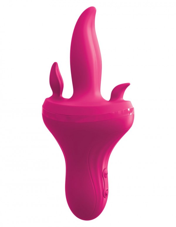 Вибратор представляет собой 3 язычка, 2 из которых предназначены для стимуляции клитора и ануса, а центральный для ласк лона и стимуляции G-точки! Вагинальный язычок обладает мощной вибрацией, а мини язычки вращаются в различных направлениях!